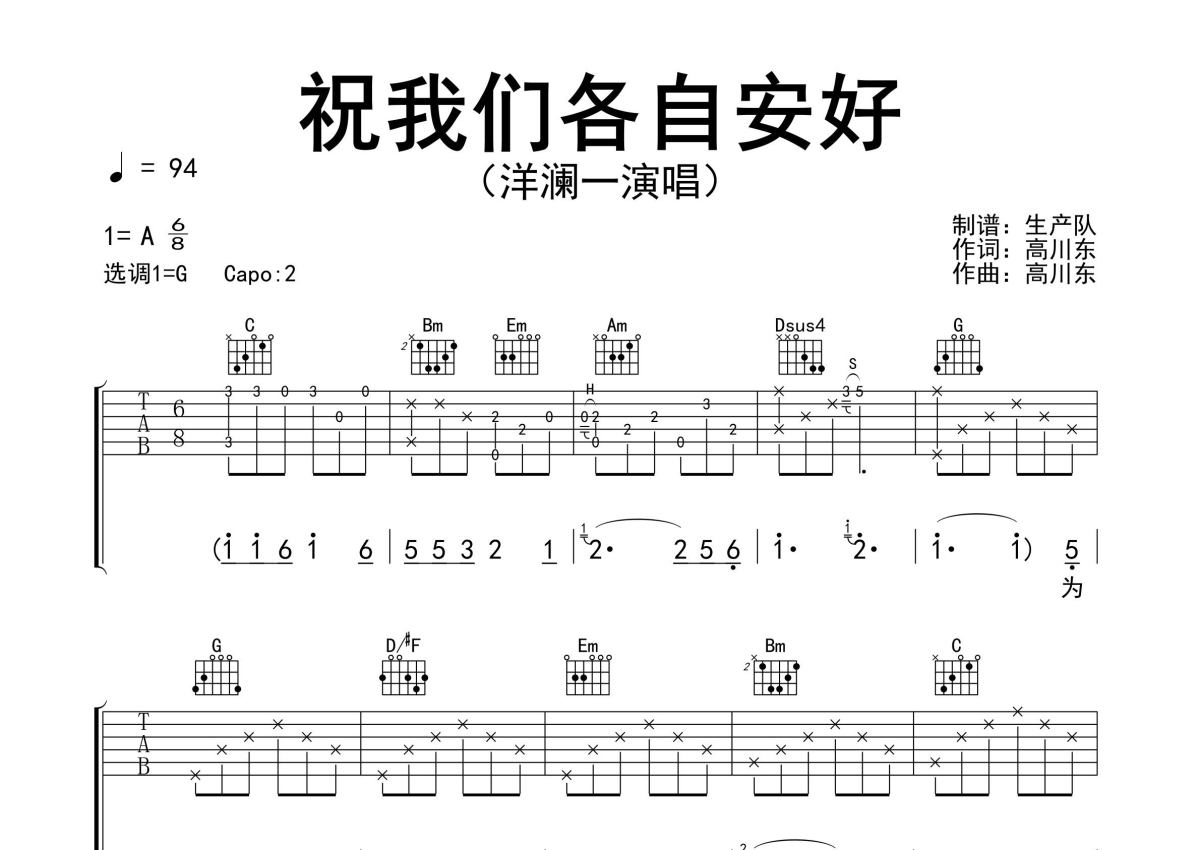 《祝我们各自安好》是洋澜一演唱的一首歌曲,精编完美版,拍号为6/8拍,歌曲速度为每分钟94拍,歌曲原调为A调,但由于原调指法比较难,为了方便弹奏,本吉他谱采用的是G调指法编配,变调夹2品弹奏即为原调,当然也可以根据自己的音域改变变调夹位置,或者通过改变和弦调性,以方便自己弹奏,这份吉他谱共有三张高清图谱,图谱由 @生产队 编配上传,图谱使用六线谱编配,包含吉他和弦指法、简谱以及歌词部分,使用这份祝我们各自安好吉他谱,可以让你更加方便地掌握这首歌曲的弹唱技巧,快来尝试吧。洋澜一演唱的歌曲《祝我们各自安好》原版吉他谱,精准的前奏、间奏、尾奏solo编配,精编完美版,值得推荐!。
