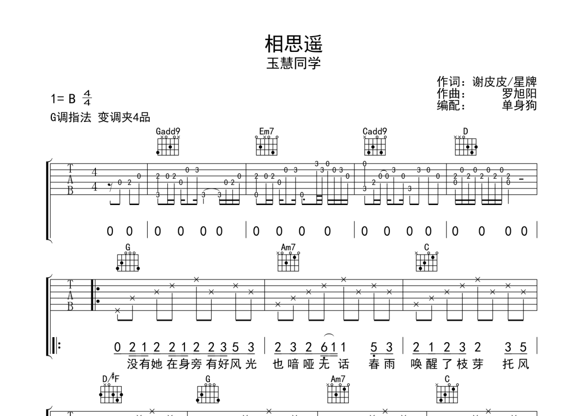 玉慧同学《相思遥》吉他谱 - G调弹唱六线谱