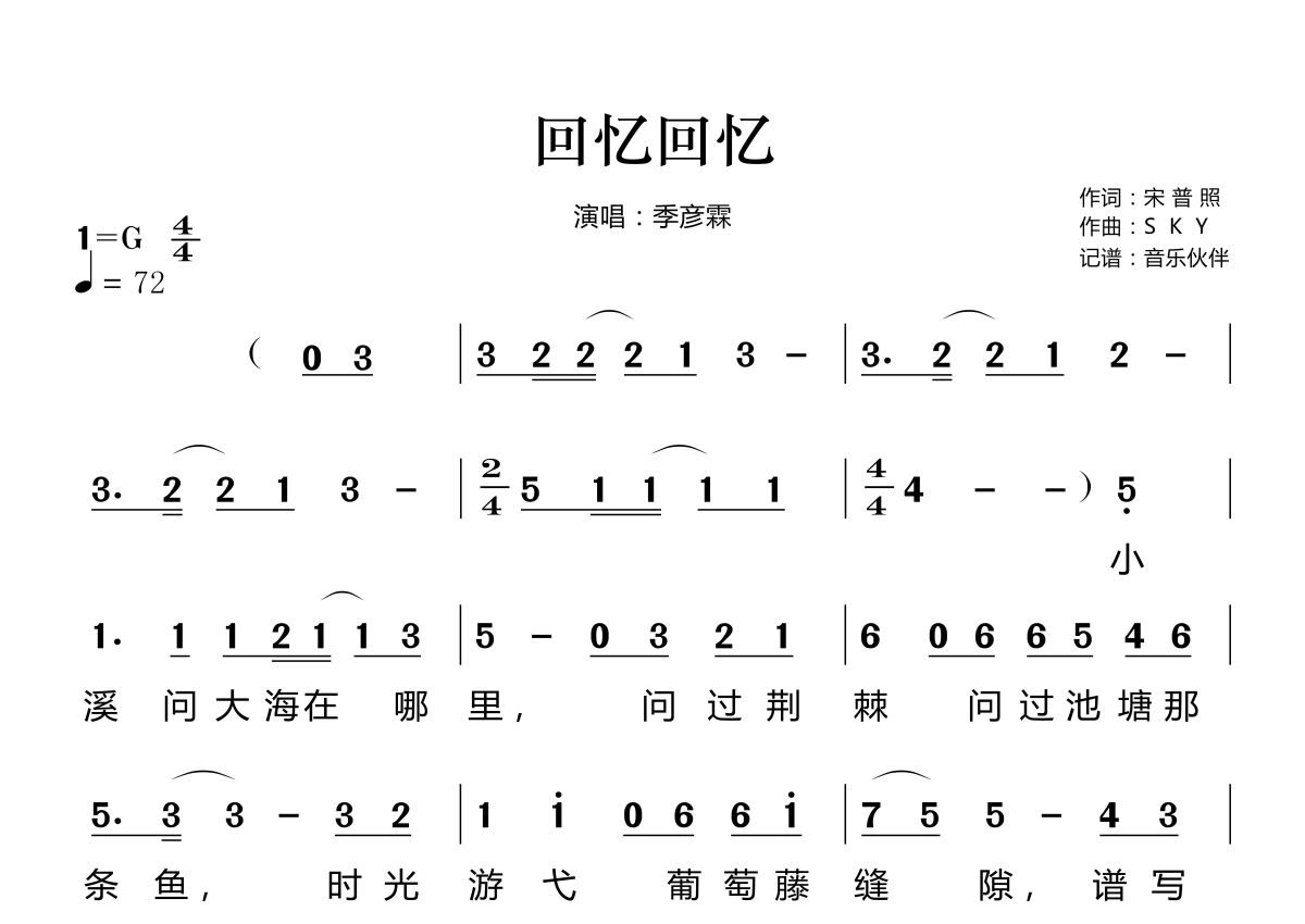 《回忆回忆》是季彦霖演唱的一首歌曲,拍号为4/4拍,歌曲速度为每分钟72拍,这份简谱共有两张高清图谱,图谱由 @音乐伙伴 编配上传。