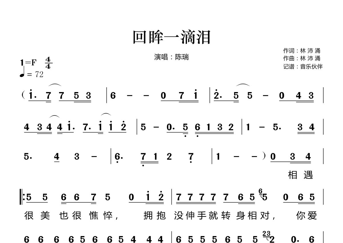 《回眸一滴泪》是陈瑞演唱的一首歌曲,拍号为4/4拍,歌曲速度为每分钟72拍,这份简谱共有两张高清图谱,图谱由 @音乐伙伴 编配上传。