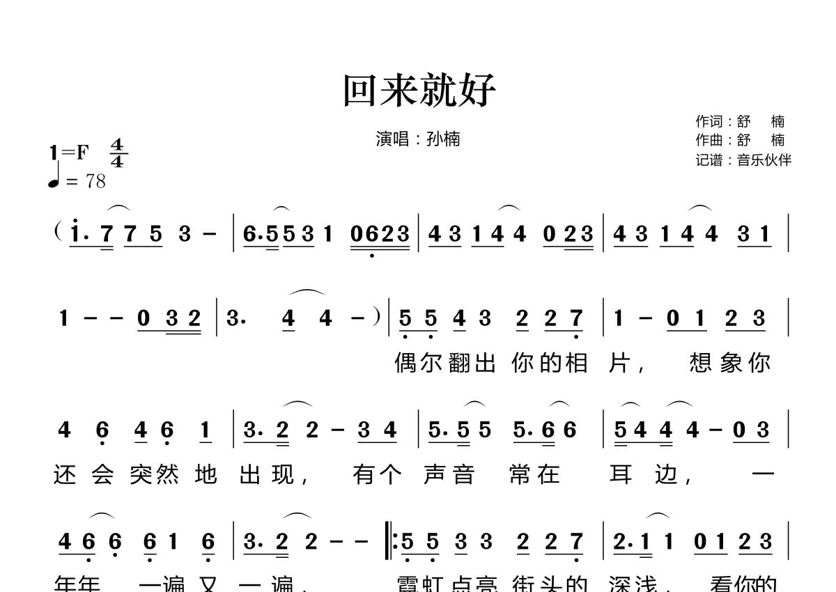 《回来就好》是孙楠演唱的一首歌曲,这份简谱共有两张高清图谱,图谱由 @音乐伙伴 编配上传。
