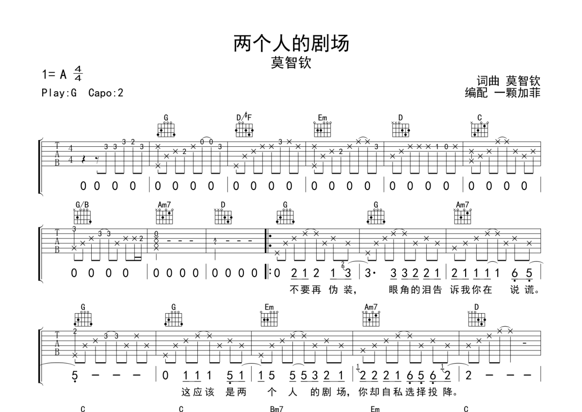 莫智钦《两个人的剧场》吉他谱 - G调弹唱六线谱