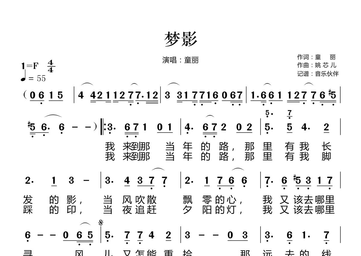 《梦影》是童丽演唱的一首歌曲,拍号为4/4拍,歌曲速度为每分钟55拍,这份简谱共有一张高清图谱,图谱由 @音乐伙伴 编配上传。