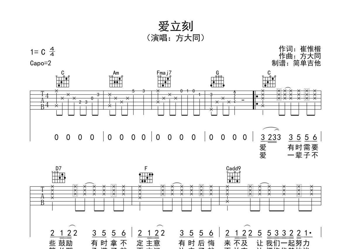 方大同《爱立刻》吉他谱 - C调弹唱六线谱