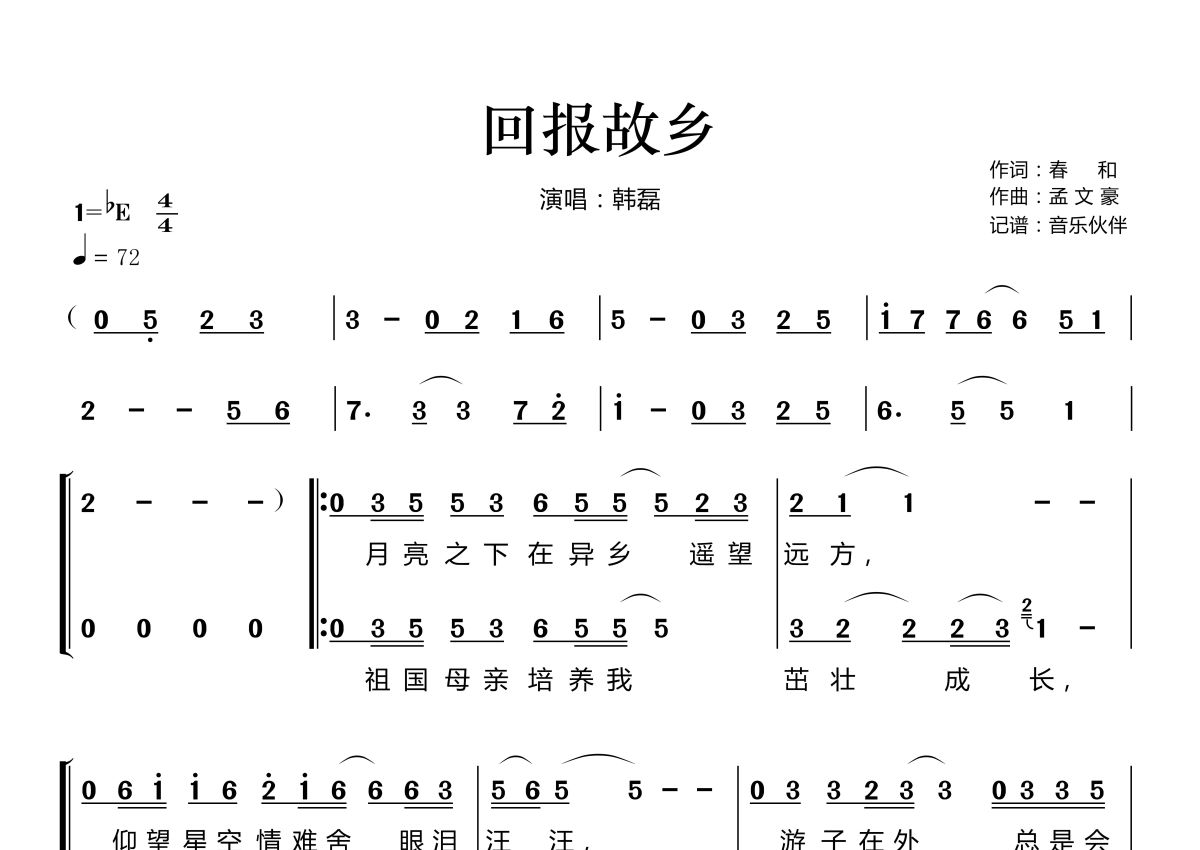 《回报故乡》是韩磊演唱的一首歌曲,这份简谱共有两张高清图谱,图谱由 @音乐伙伴 编配上传。