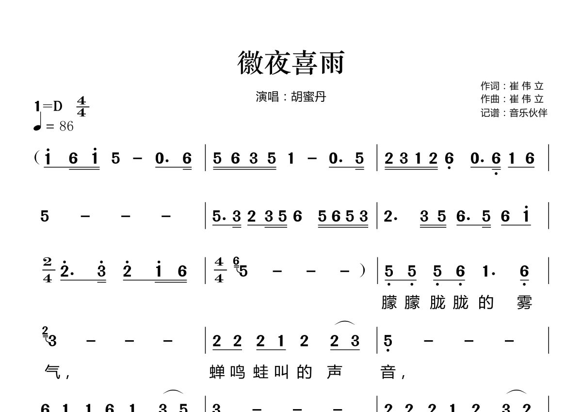 《徽夜喜雨》是胡蜜丹演唱的一首歌曲,拍号为4/4拍,歌曲速度为每分钟86拍,这份简谱共有两张高清图谱,图谱由 @音乐伙伴 编配上传。