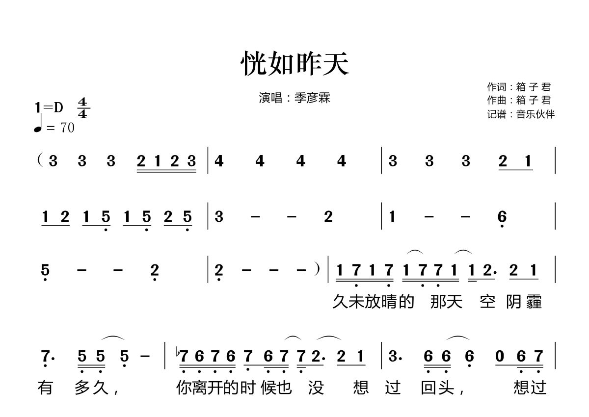 《恍如昨天》是季彦霖演唱的一首歌曲,拍号为4/4拍,歌曲速度为每分钟70拍,这份简谱共有两张高清图谱,图谱由 @音乐伙伴 编配上传。