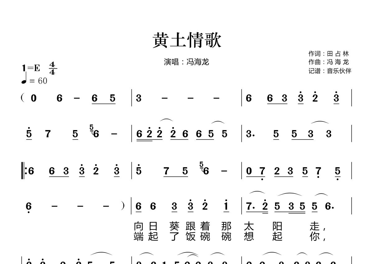 《黄土情歌》是冯海龙演唱的一首歌曲,拍号为4/4拍,歌曲速度为每分钟60拍,这份简谱共有两张高清图谱,图谱由 @音乐伙伴 编配上传。