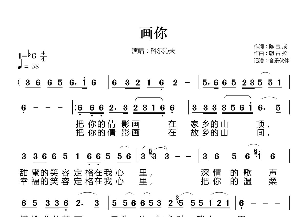《画你》是科尔沁夫演唱的一首歌曲,拍号为4/4拍,歌曲速度为每分钟58拍,这份简谱共有两张高清图谱,图谱由 @音乐伙伴 编配上传。