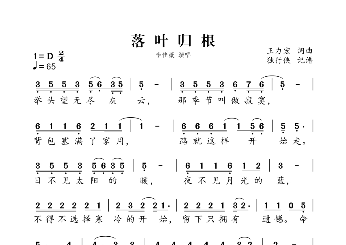 《落叶归根》是李佳薇演唱的一首歌曲,拍号为2/4拍,歌曲速度为每分钟63拍,这份简谱共有三张高清图谱,图谱由 @独行侠 编配上传。