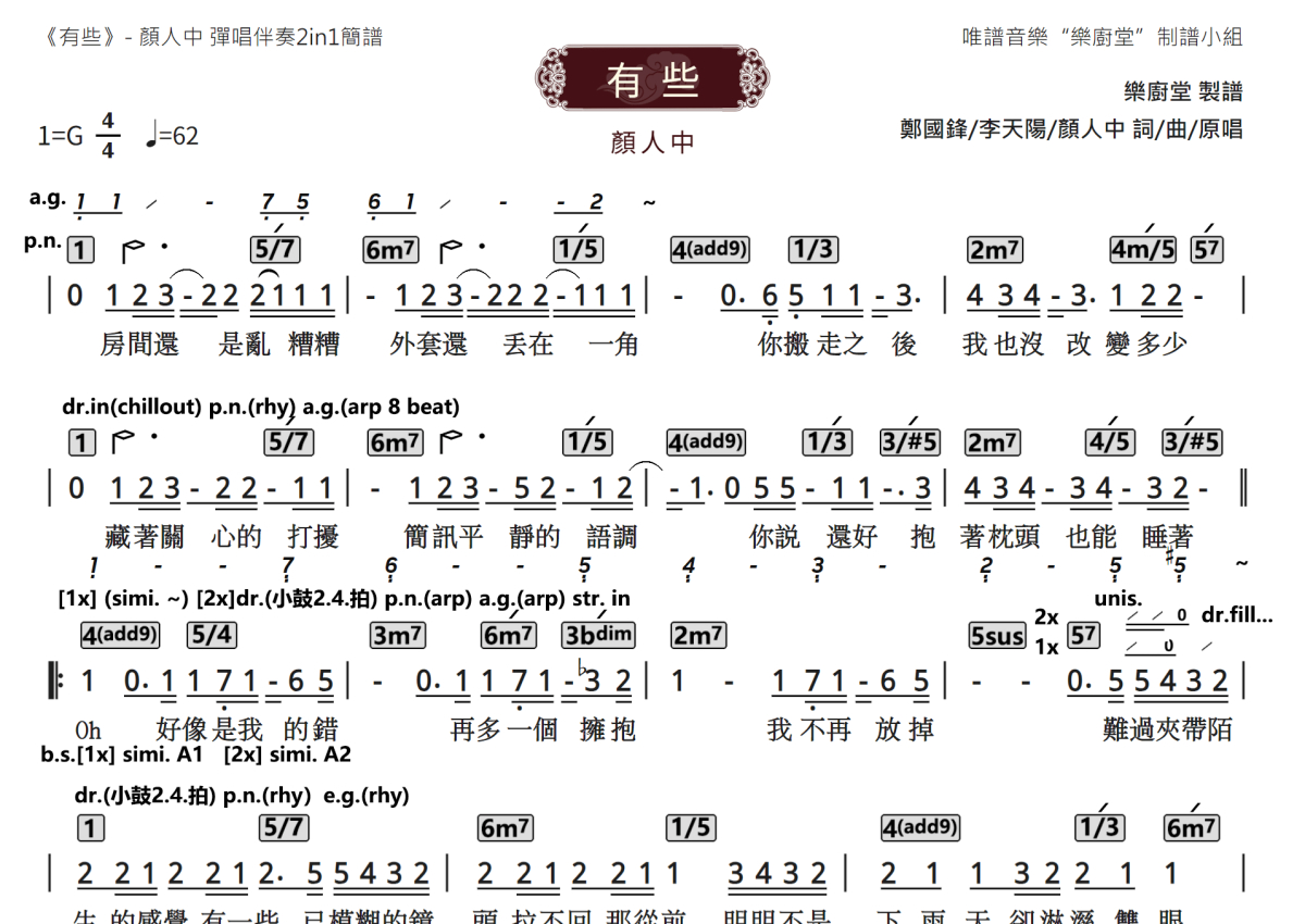 《有些》是颜人中演唱的一首歌曲,拍号为4/4拍,歌曲速度为每分钟62拍,这份乐队总谱共有两张高清图谱,图谱由 @唯谱音乐"乐厨堂"发布小组 编配上传。