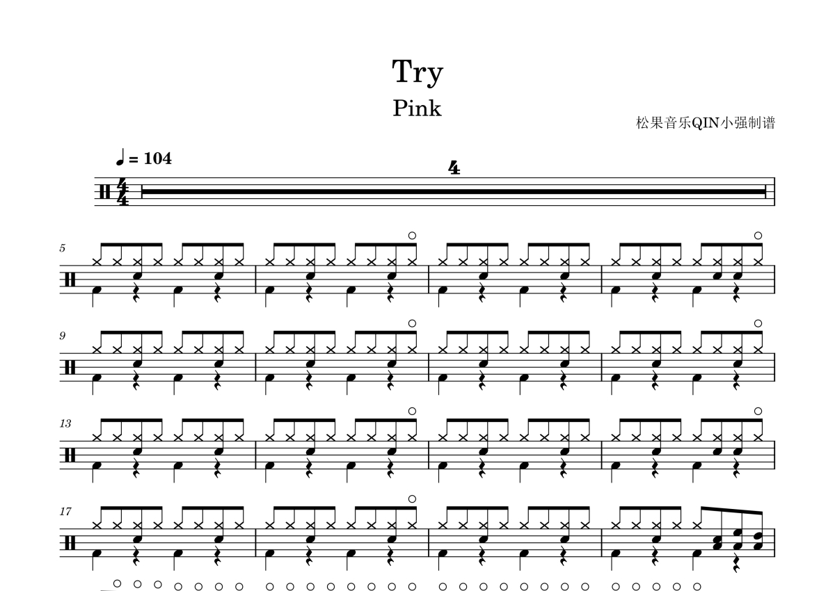 《Try》是P!nk演唱的一首歌曲,拍号为4/4拍,歌曲速度为每分钟104拍,这份架子鼓谱共有三张高清图谱,图谱由 @松果音乐QIN小强 编配上传,图谱使用五线谱编配,使用这份Try架子鼓谱,你将能够轻松地敲打出这首P!nk的Try,快来尝试吧。《Try》是P!nk演唱的歌曲,由迈克尔·布斯比和本·维斯特创作,格雷格·库鲁斯廷制作,收录于P!nk第六张录音室专辑《The Truth About Love》中,并作为推广专辑的的第二支单曲于2012年10月19日通过美国广播唱片公司发行。