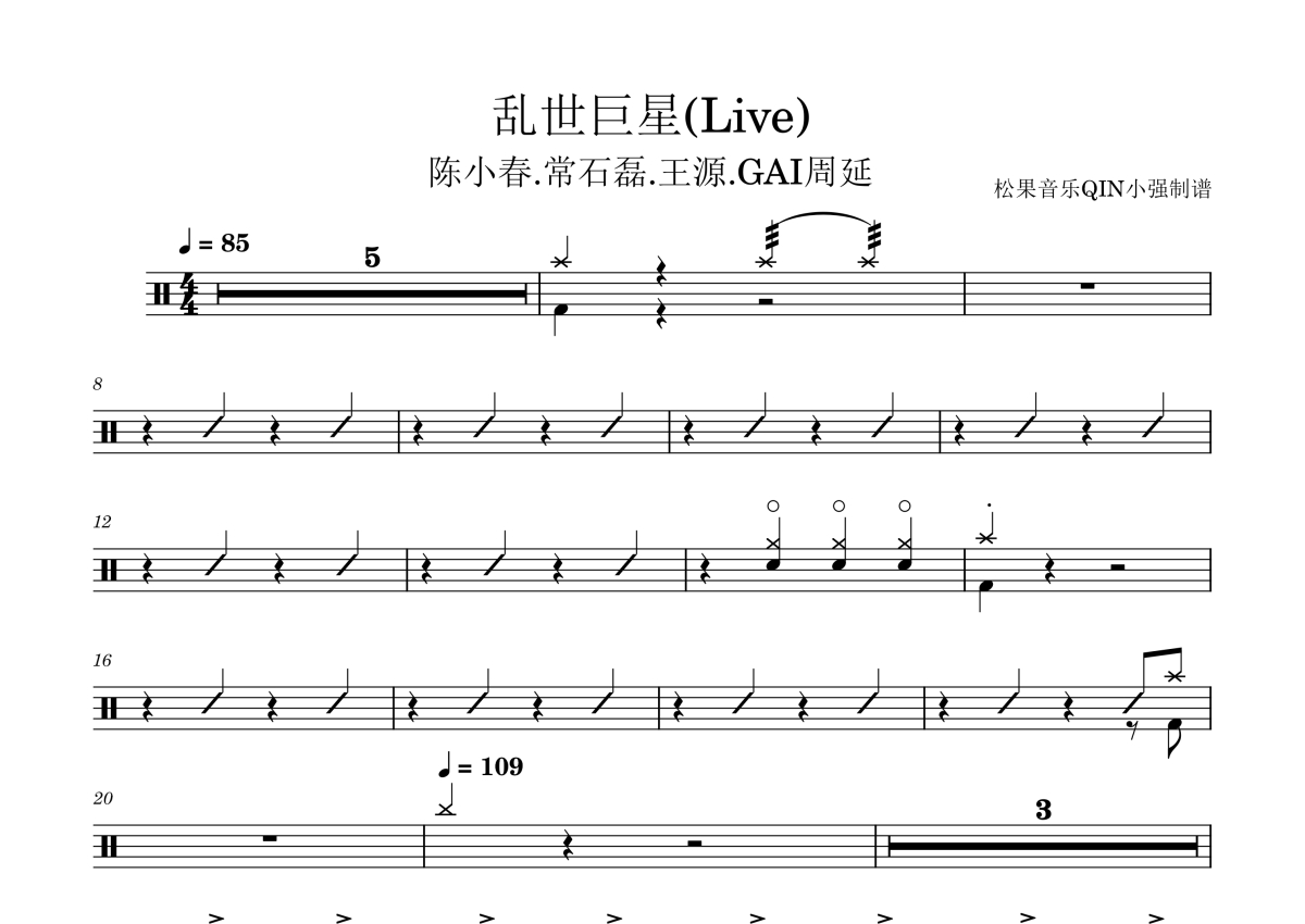 《乱世巨星(live)》是陈小春、常石磊、王源、GAI周延演唱的一首歌曲,live,拍号为4/4拍,歌曲速度为每分钟85拍,这份架子鼓谱共有四张高清图谱,图谱由 @松果音乐QIN小强 编配上传,图谱使用五线谱编配,使用这份乱世巨星(live)架子鼓谱,你将能够轻松地敲打出这首陈小春、常石磊、王源、GAI周延的乱世巨星(live),快来尝试吧。《乱世巨星》是陈小春、GAI、常石磊、王源演唱的歌曲。