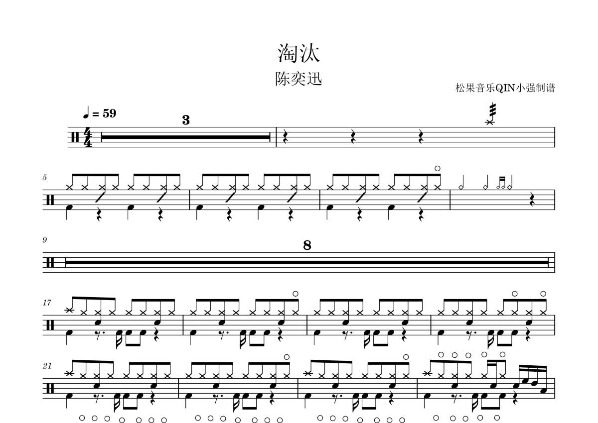 《淘汰》是陈奕迅演唱的一首歌曲,拍号为4/4拍,歌曲速度为每分钟59拍,这份架子鼓谱共有两张高清图谱,图谱由 @松果音乐QIN小强 编配上传,图谱使用五线谱编配,使用这份淘汰架子鼓谱,你将能够轻松地敲打出这首陈奕迅的淘汰,快来尝试吧。《淘汰》是陈奕迅演唱的抒情流行歌曲,由周杰伦创作词曲,江志仁编曲,收录在陈奕迅于2007年4月24日发行的个人音乐专辑《认了吧》中。