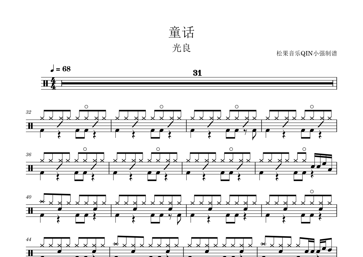 《童话》是光良演唱的一首歌曲,拍号为4/4拍,歌曲速度为每分钟68拍,这份架子鼓谱共有一张高清图谱,图谱由 @松果音乐QIN小强 编配上传,图谱使用五线谱编配,使用这份童话架子鼓谱,你将能够轻松地敲打出这首光良的童话,快来尝试吧。《童话》是光良演唱的流行歌曲,由光良作词、作曲,Taichi Nakamura编曲,收录在光良于2005年1月21日发行的同名专辑《童话》中。