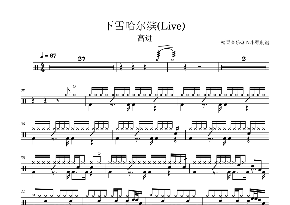 《下雪的哈尔滨》是高进演唱的一首歌曲,Live,拍号为4/4拍,歌曲速度为每分钟67拍,这份架子鼓谱共有两张高清图谱,图谱由 @松果音乐QIN小强 编配上传,图谱使用五线谱编配,使用这份下雪的哈尔滨架子鼓谱,你将能够轻松地敲打出这首高进的下雪的哈尔滨,快来尝试吧。《下雪哈尔滨》是由高进作词作曲并演唱的一首歌曲,该曲于2019年4月12日在《我是唱作人》第一期演唱。