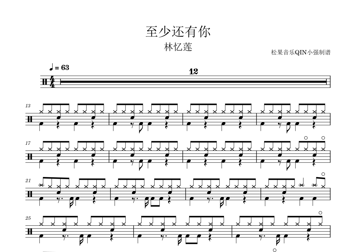 《至少还有你》是林忆莲演唱的一首歌曲,拍号为4/4拍,歌曲速度为每分钟63拍,这份架子鼓谱共有两张高清图谱,图谱由 @松果音乐QIN小强 编配上传,图谱使用五线谱编配,使用这份至少还有你架子鼓谱,你将能够轻松地敲打出这首林忆莲的至少还有你,快来尝试吧。《至少还有你》是由林夕作词,Davy Chan(陈匡荣)作曲,刘志远编曲,林忆莲演唱的歌曲。