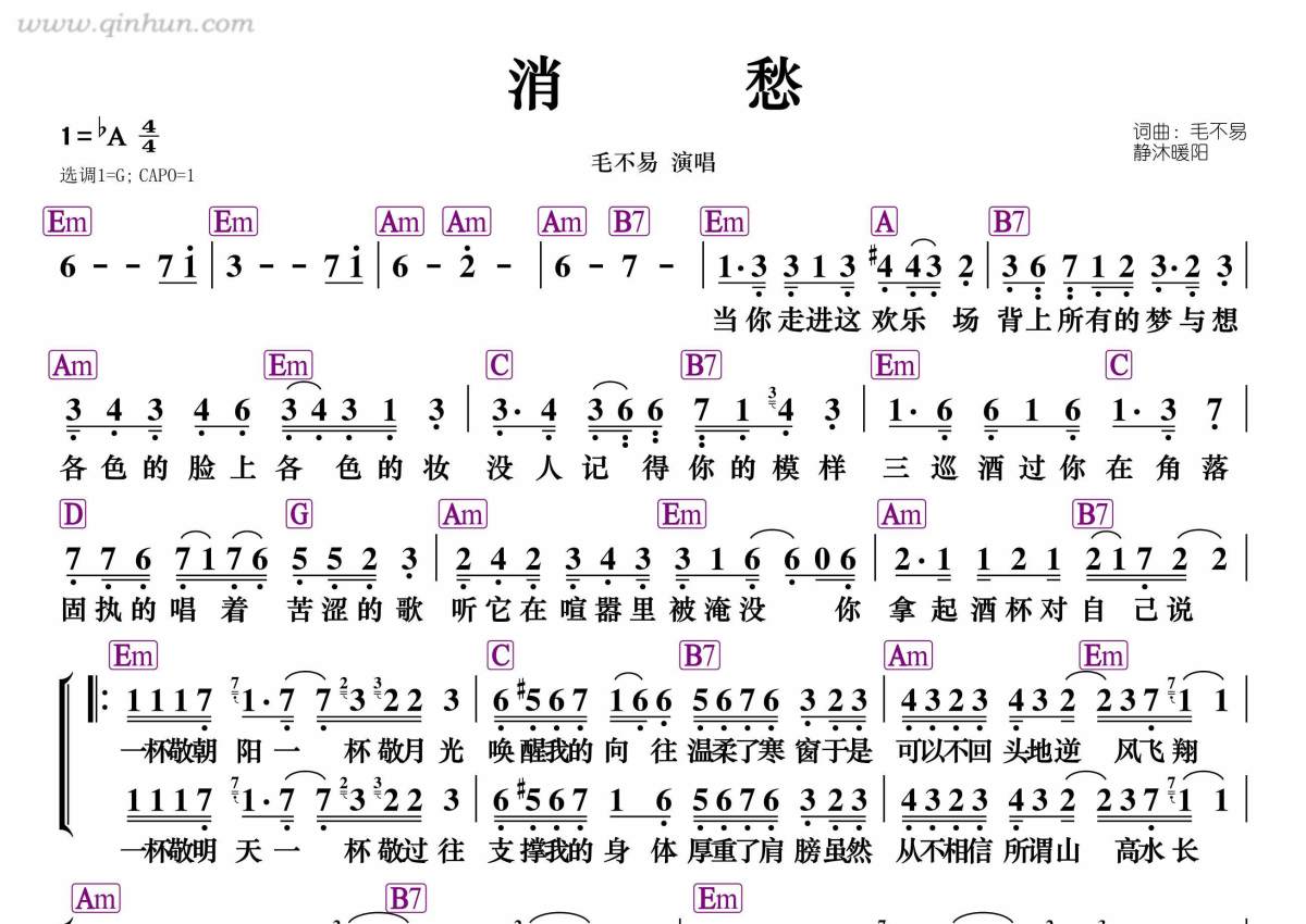 《消愁》是毛不易演唱的一首歌曲,和弦谱,拍号为4/4拍,这份简谱共有一张高清图谱,图谱由 @静沐暖阳 编配上传。