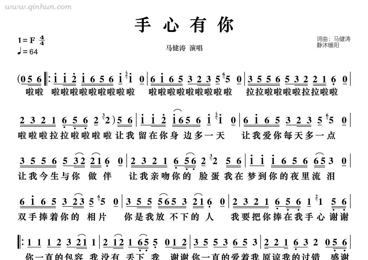 《手心有你》是马健涛演唱的一首歌曲,拍号为4/4拍,歌曲速度为每分钟64拍,这份简谱共有一张高清图谱,图谱由 @静沐暖阳 编配上传。