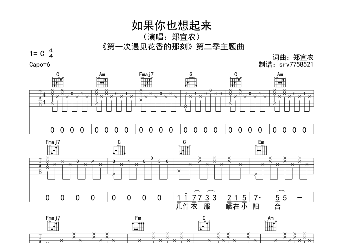 郑宜农郑宜农《如果你也想起来》吉他谱 - C调弹唱六线谱