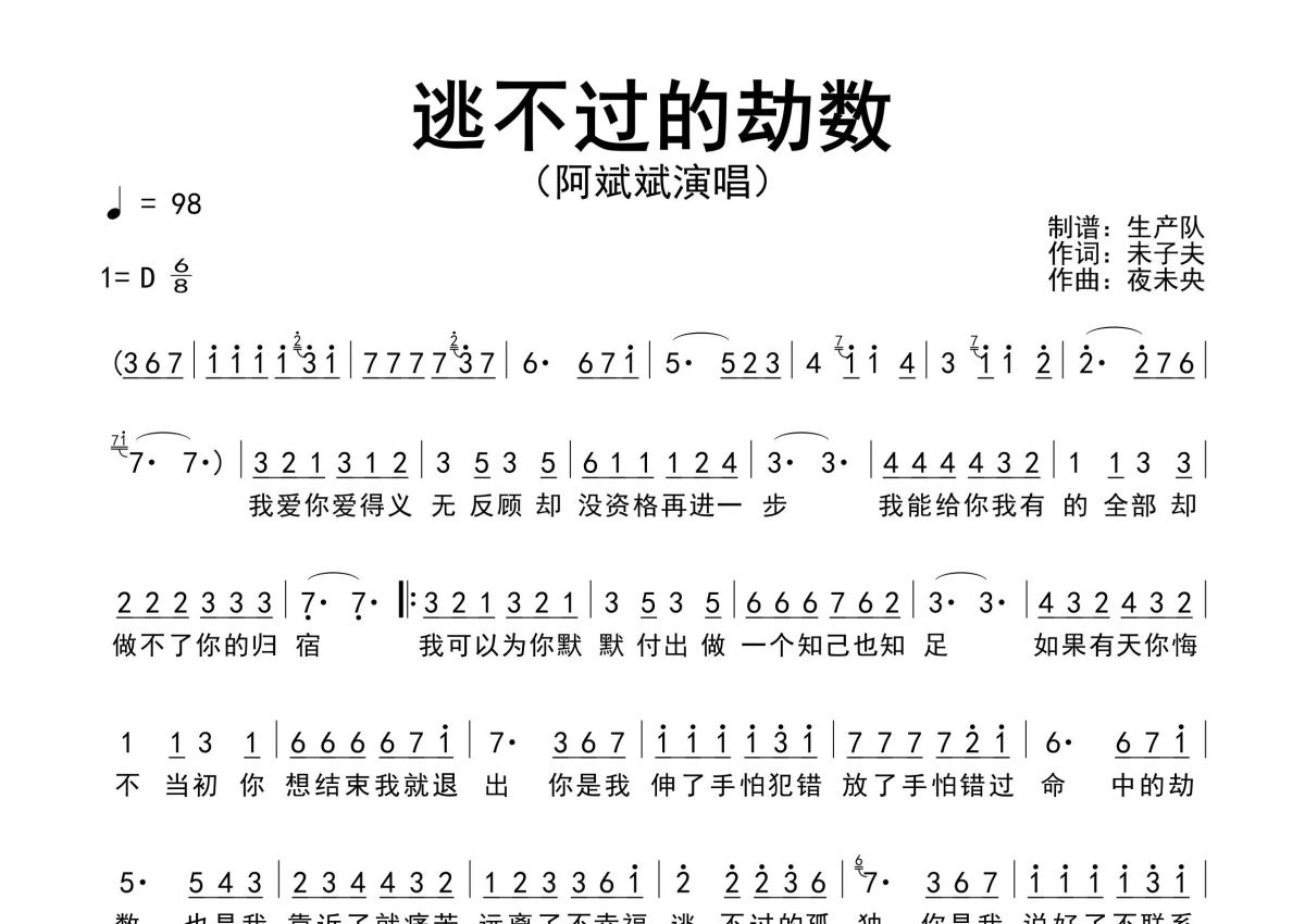 《逃不过的劫数》是阿斌斌演唱的一首歌曲,原版简谱,拍号为6/8拍,歌曲速度为每分钟98拍,这份简谱共有一张高清图谱,图谱由 @生产队 编配上传阿斌斌演唱的歌曲《逃不过的劫数》原版简谱,精准的前奏、间奏、尾奏solo编配。