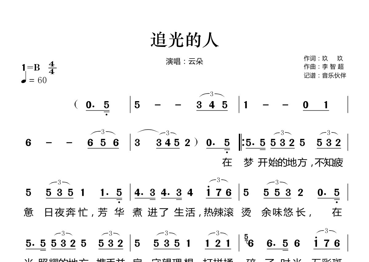 《追光的人》是云朵演唱的一首歌曲,拍号为4/4拍,歌曲速度为每分钟60拍,这份简谱共有两张高清图谱,图谱由 @音乐伙伴 编配上传。