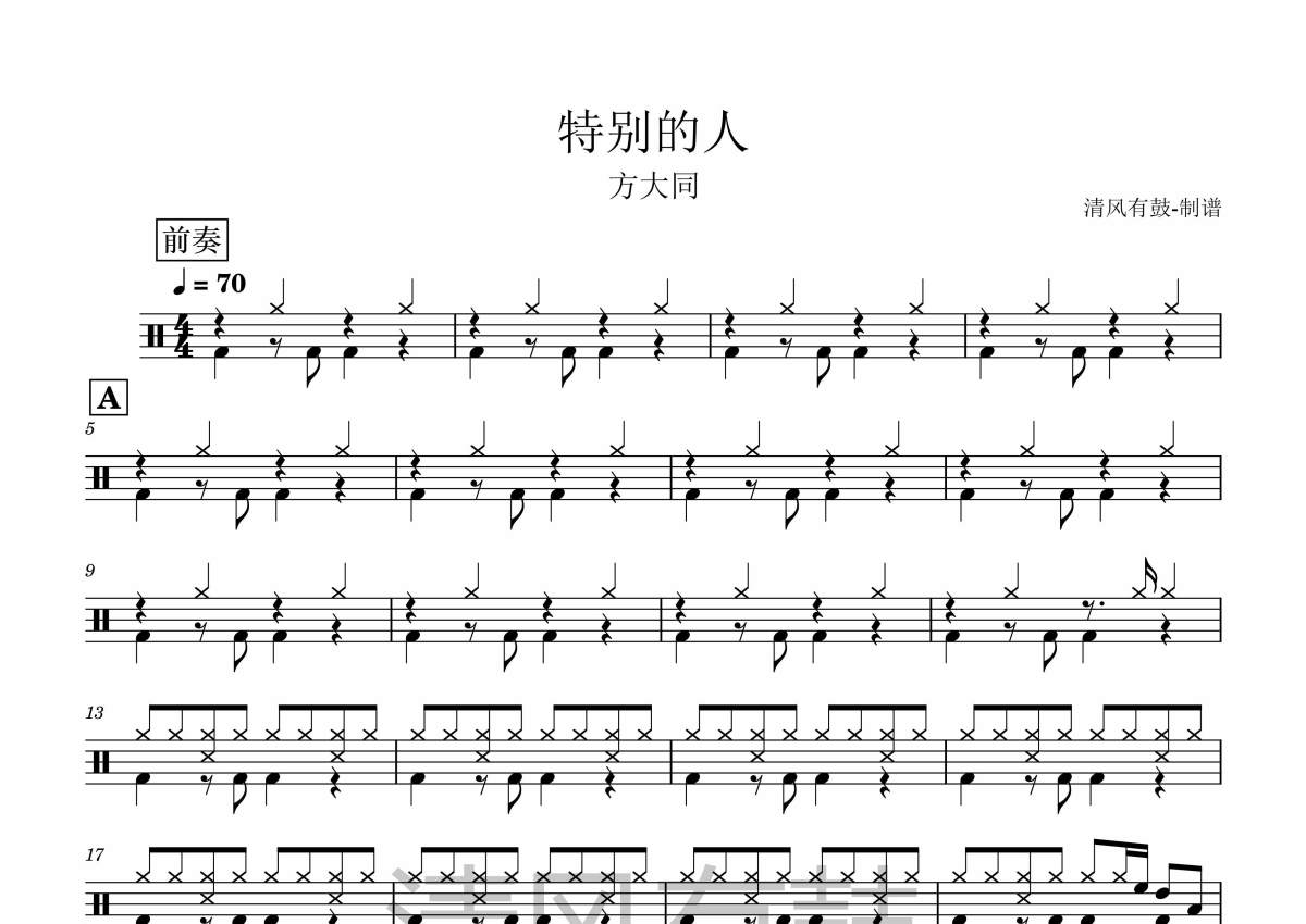 《特别的人》是方大同演唱的一首歌曲,拍号为4/4拍,这份架子鼓谱共有两张高清图谱,图谱由 @清风有鼓 编配上传,图谱使用五线谱编配,使用这份特别的人架子鼓谱,你将能够轻松地敲打出这首方大同的特别的人,快来尝试吧。