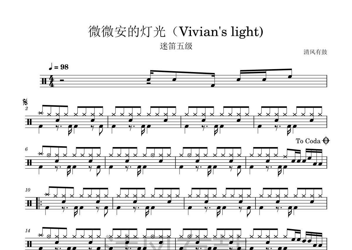 《微微安的灯光》是(Vivian's light)演唱的一首歌曲,拍号为4/4拍,这份架子鼓谱共有一张高清图谱,图谱由 @清风有鼓 编配上传,图谱使用五线谱编配,使用这份微微安的灯光架子鼓谱,你将能够轻松地敲打出这首(Vivian's light)的微微安的灯光,快来尝试吧。