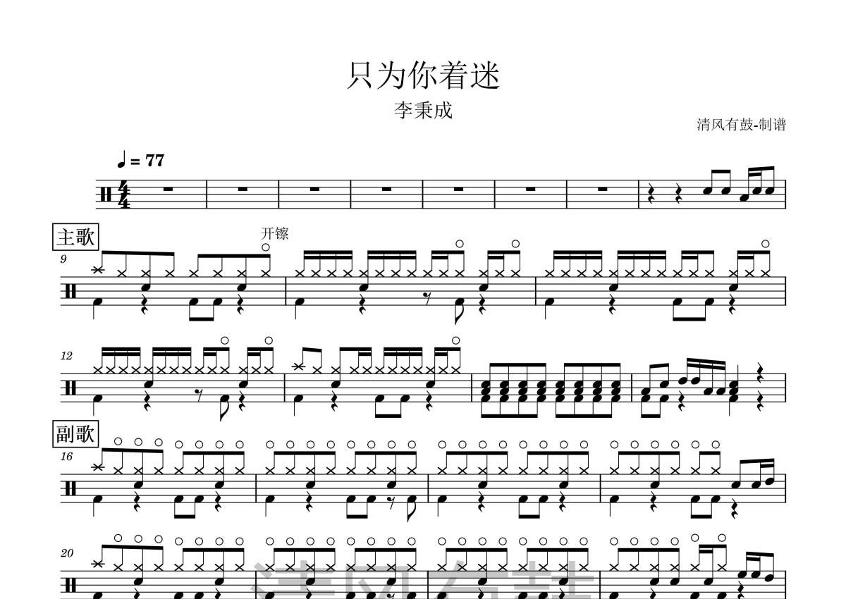 《只为你着迷》是李秉承演唱的一首歌曲,拍号为4/4拍,这份架子鼓谱共有两张高清图谱,图谱由 @清风有鼓 编配上传,图谱使用五线谱编配,使用这份只为你着迷架子鼓谱,你将能够轻松地敲打出这首李秉承的只为你着迷,快来尝试吧。