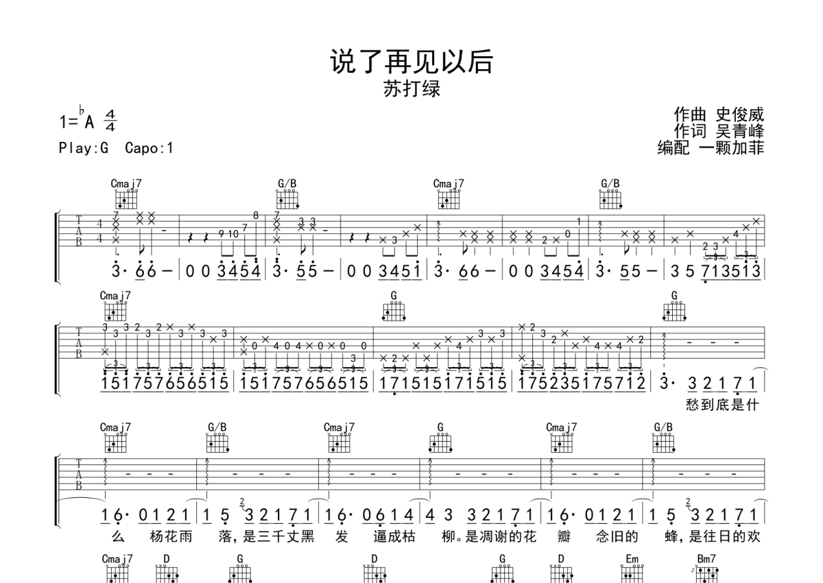 《说了再见以后》是苏打绿演唱的一首歌曲,本吉他谱采用的是G调指法编配,这份吉他谱共有两张高清图谱,图谱由 @一颗加菲 编配上传,图谱使用六线谱编配,包含吉他和弦指法、简谱以及歌词部分,曲谱配备了相关的音频提供试听,使用这份说了再见以后吉他谱,可以让你更加方便地掌握这首歌曲的弹唱技巧,快来尝试吧。