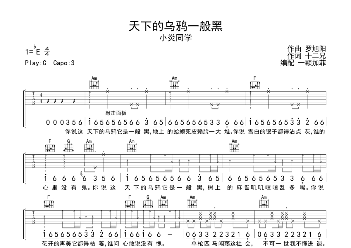 《天下的乌鸦一般黑》是小炎同学演唱的一首歌曲,本吉他谱采用的是C调指法编配,这份吉他谱共有两张高清图谱,图谱由 @一颗加菲 编配上传,图谱使用六线谱编配,包含吉他和弦指法、简谱以及歌词部分,曲谱配备了相关的音频提供试听,使用这份天下的乌鸦一般黑吉他谱,可以让你更加方便地掌握这首歌曲的弹唱技巧,快来尝试吧。