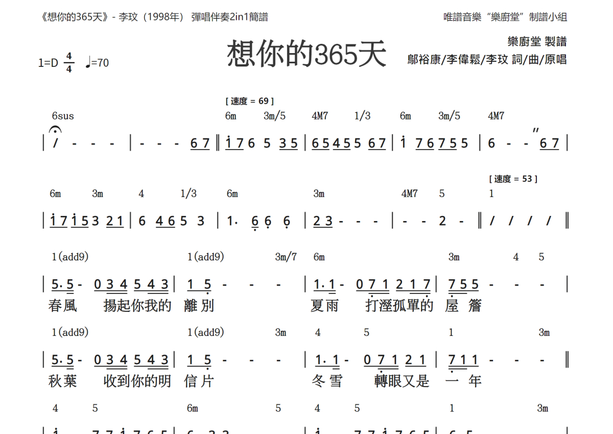 《想你的365天》是李玟演唱的一首歌曲,和弦简谱,这份简谱共有两张高清图谱,图谱由 @唯谱音乐"乐厨堂"发布小组 编配上传。