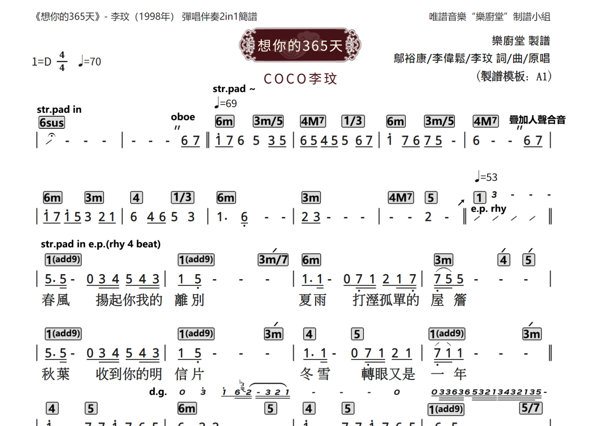 《想你的365天》是李玟演唱的一首歌曲,这份乐队总谱共有两张高清图谱,图谱由 @唯谱音乐"乐厨堂"发布小组 编配上传。