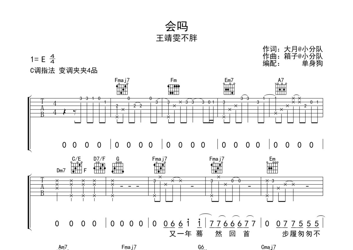 《会吗》是王靖雯不胖演唱的一首歌曲,本吉他谱采用的是C调指法编配,这份吉他谱共有三张高清图谱,图谱由 @单身狗 编配上传,图谱使用六线谱编配,包含吉他和弦指法、简谱以及歌词部分,使用这份会吗吉他谱,可以让你更加方便地掌握这首歌曲的弹唱技巧,快来尝试吧。王靖雯不胖《会吗》吉他弹唱谱,采用C调指法编配,单身狗编配出品,共有3张高清图谱。