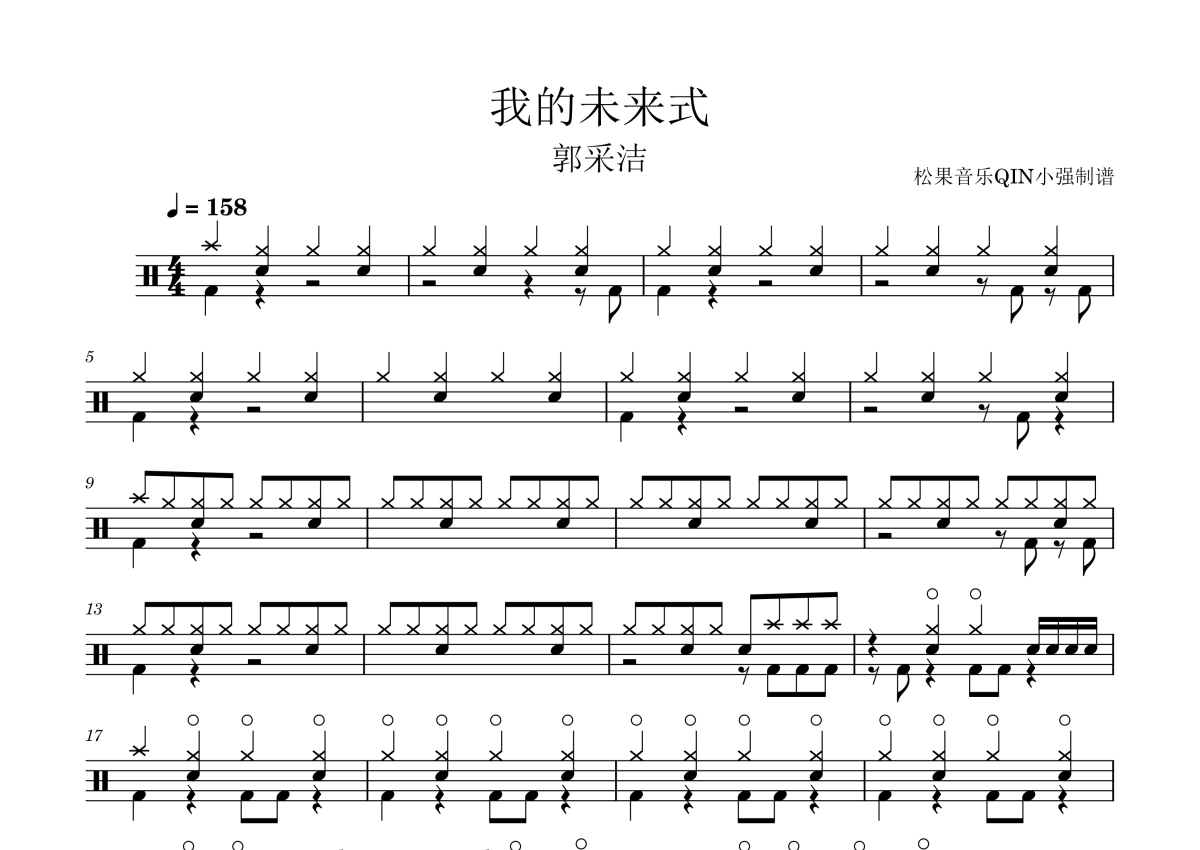 《我的未来式》是郭采洁演唱的一首歌曲,拍号为4/4拍,这份架子鼓谱共有三张高清图谱,图谱由 @松果音乐QIN小强 编配上传,图谱使用五线谱编配,使用这份我的未来式架子鼓谱,你将能够轻松地敲打出这首郭采洁的我的未来式,快来尝试吧。《我的未来式》是郭采洁演唱的一首歌曲,由刘伟恩作词,Jun Gyu Jeon 作曲,收录在2007年12月25日发行的专辑《隐形超人》中。这首歌同时也是电视剧《爱情公寓》的主题曲(注:歌曲原唱是郭采洁,电视剧版是陈每文)。