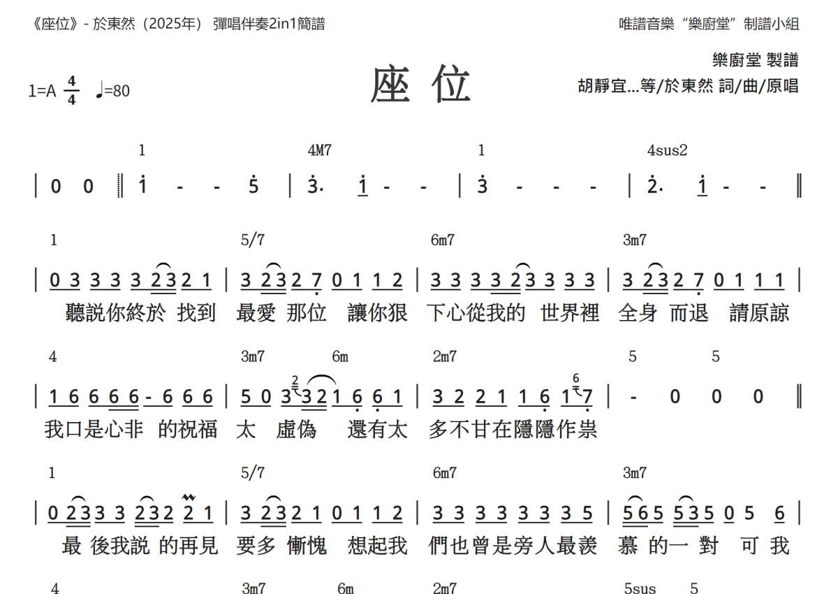 《座位》是于东然演唱的一首歌曲,和弦简谱,这份简谱共有两张高清图谱,图谱由 @唯谱音乐"乐厨堂"发布小组 编配上传。