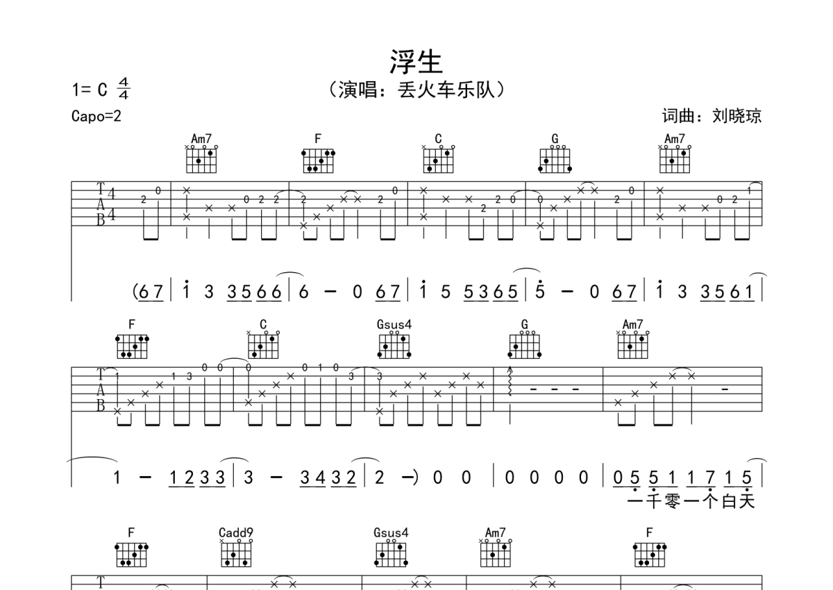 丢火车《浮生》吉他谱 - C调弹唱六线谱