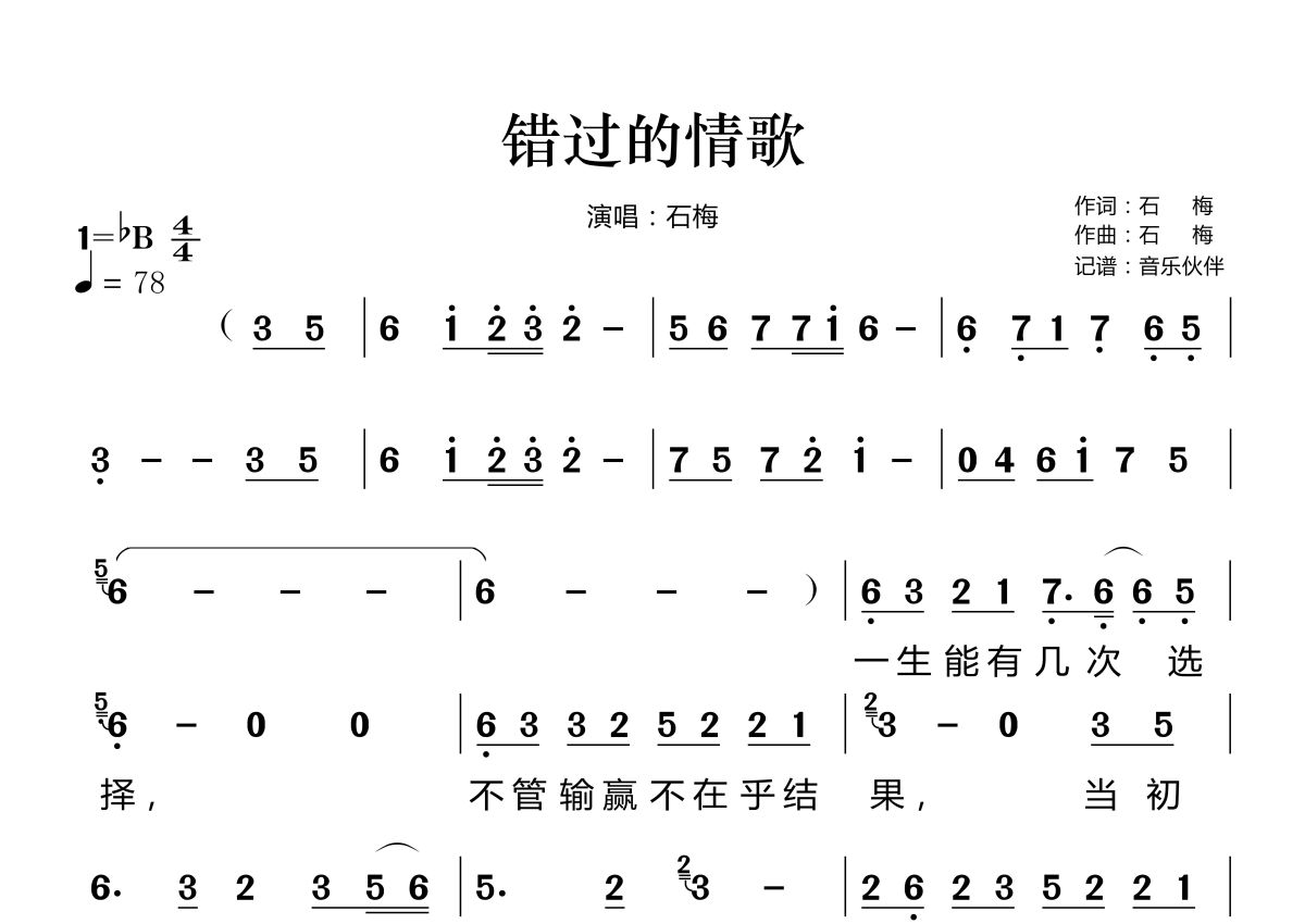 《错过的情歌》是石梅演唱的一首歌曲,拍号为4/4拍,歌曲速度为每分钟78拍,这份简谱共有两张高清图谱,图谱由 @音乐伙伴 编配上传。