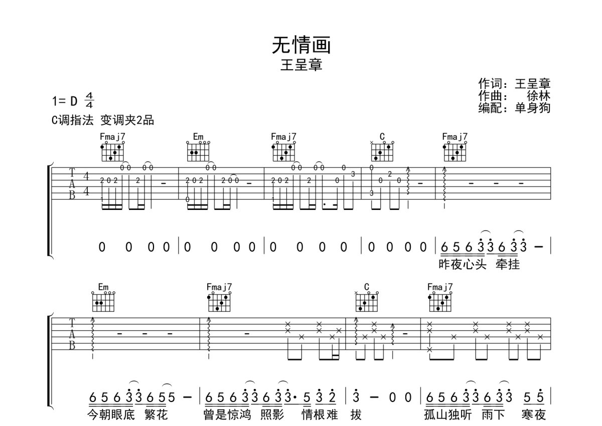 《无情画》是王呈章演唱的一首歌曲,本吉他谱采用的是C调指法编配,这份吉他谱共有两张高清图谱,图谱由 @单身狗 编配上传,图谱使用六线谱编配,包含吉他和弦指法、简谱以及歌词部分,使用这份无情画吉他谱,可以让你更加方便地掌握这首歌曲的弹唱技巧,快来尝试吧。王呈章《无情画》吉他弹唱谱,采用C调指法编配,单身狗编配出品,共有2张高清图谱,免翻页排版设计。