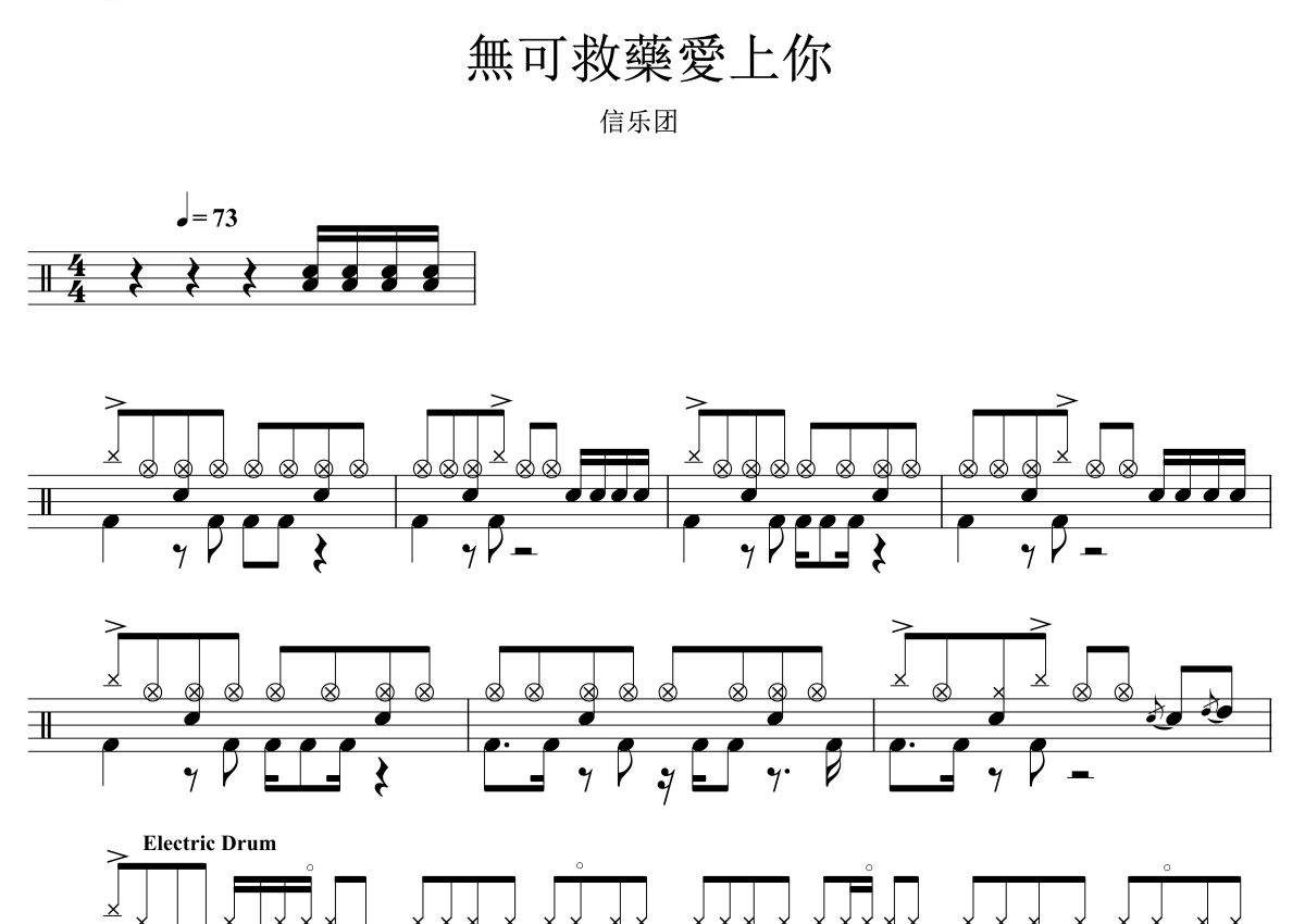《无可救药爱上你》是信乐团演唱的一首歌曲,拍号为4/4拍,歌曲速度为每分钟73拍,这份架子鼓谱共有四张高清图谱,图谱由 @音符喷血者 编配上传,图谱使用五线谱编配,使用这份无可救药爱上你架子鼓谱,你将能够轻松地敲打出这首信乐团的无可救药爱上你,快来尝试吧。