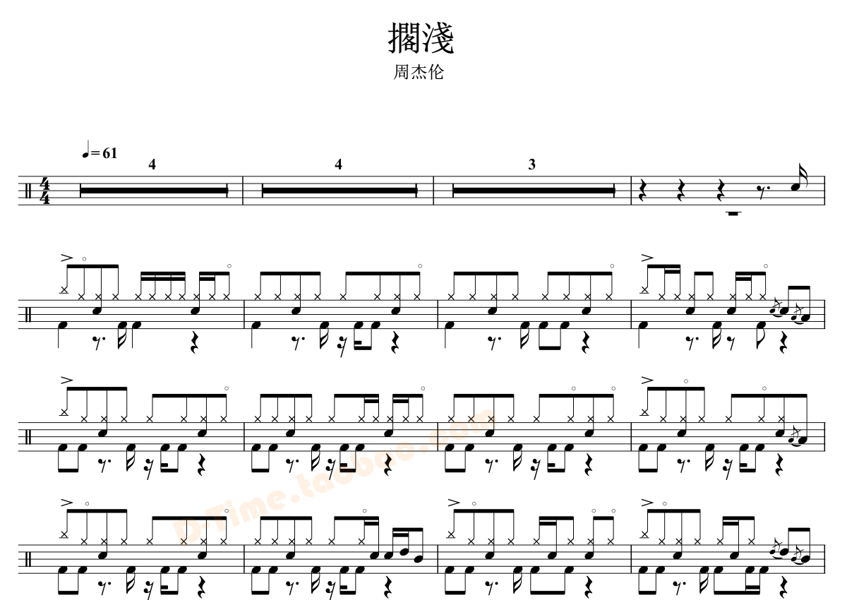 《搁浅》是周杰伦演唱的一首歌曲,拍号为4/4拍,歌曲速度为每分钟61拍,这份架子鼓谱共有两张高清图谱,图谱由 @音符喷血者 编配上传,图谱使用五线谱编配,使用这份搁浅架子鼓谱,你将能够轻松地敲打出这首周杰伦的搁浅,快来尝试吧。