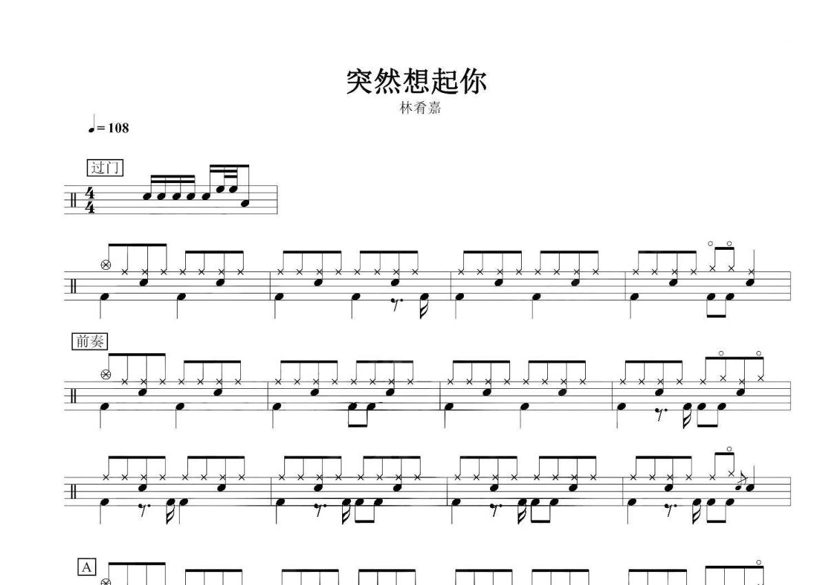 《突然想起你》是林宥嘉演唱的一首歌曲,拍号为4/4拍,歌曲速度为每分钟108拍,这份架子鼓谱共有三张高清图谱,图谱由 @音符喷血者 编配上传,图谱使用五线谱编配,使用这份突然想起你架子鼓谱,你将能够轻松地敲打出这首林宥嘉的突然想起你,快来尝试吧。