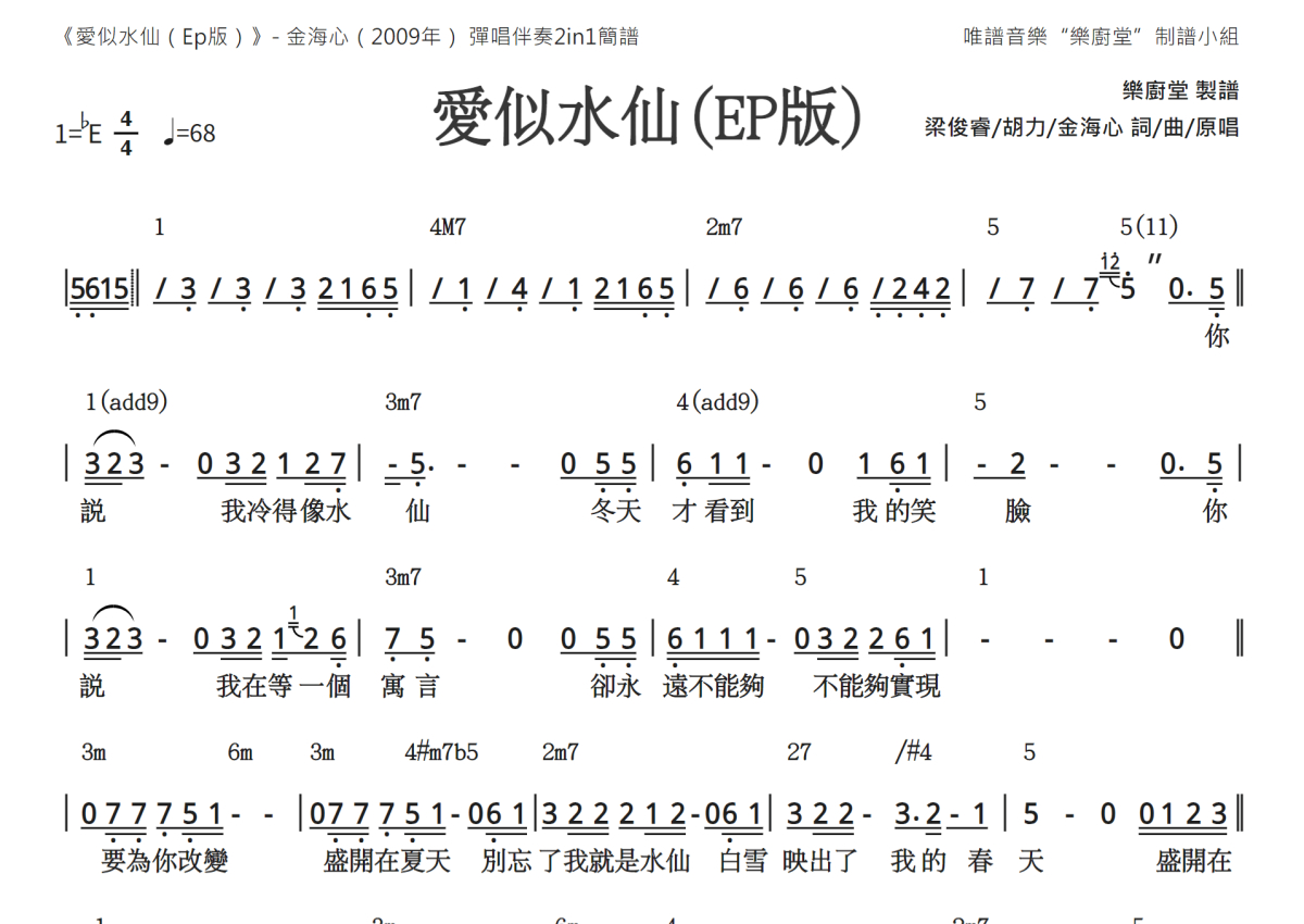 《爱似水仙(EP版)》是EP版演唱的一首歌曲,和弦简谱,这份简谱共有两张高清图谱,图谱由 @唯谱音乐"乐厨堂"发布小组 编配上传。