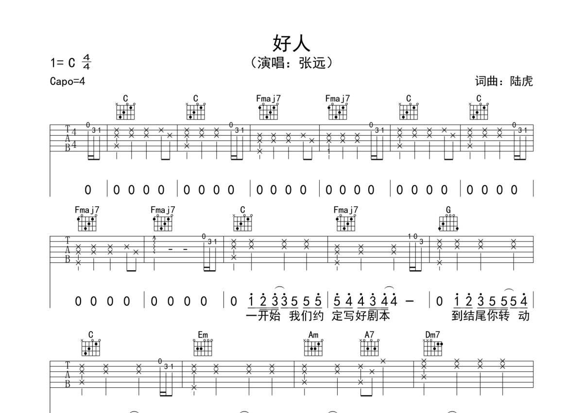 《好人》是张远演唱的一首歌曲,拍号为4/4拍,歌曲原调为E调,但由于原调指法比较难,为了方便弹奏,本吉他谱采用的是C调指法编配,变调夹4品弹奏即为原调,当然也可以根据自己的音域改变变调夹位置,或者通过改变和弦调性,以方便自己弹奏,这份吉他谱共有两张高清图谱,图谱由 @SRV7758521 编配上传,图谱使用六线谱编配,包含吉他和弦指法、简谱以及歌词部分,使用这份好人吉他谱,可以让你更加方便地掌握这首歌曲的弹唱技巧,快来尝试吧。