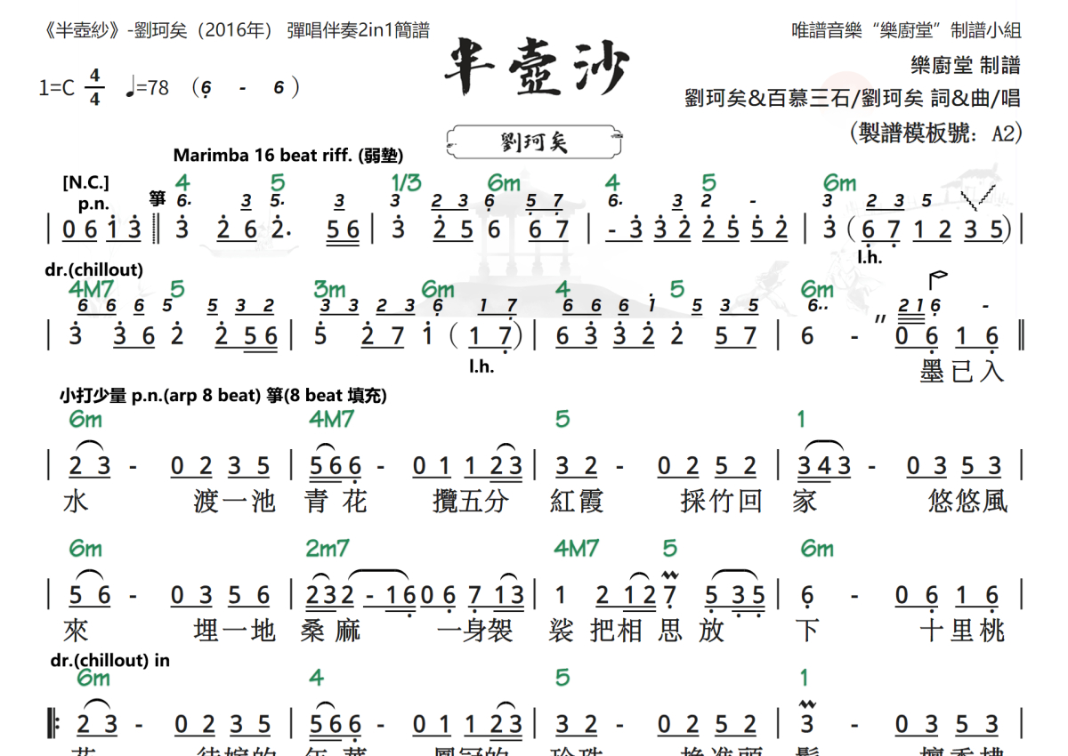 “乐厨堂”乐谱发布小组: 出版级乐谱扒谱制谱——以职业乐手圈通行标准记谱,遵循原版和声、伴奏元素和段落结构。 ❶ 2.0多功能专业团谱:采用台湾卓著公司开创的二代简谱标准制作。二代简谱无疑是迄今为止最科学、最易读的专业范畴多功能记谱方案:❷ 框架谱:采用职业乐手通常记谱方案制作。