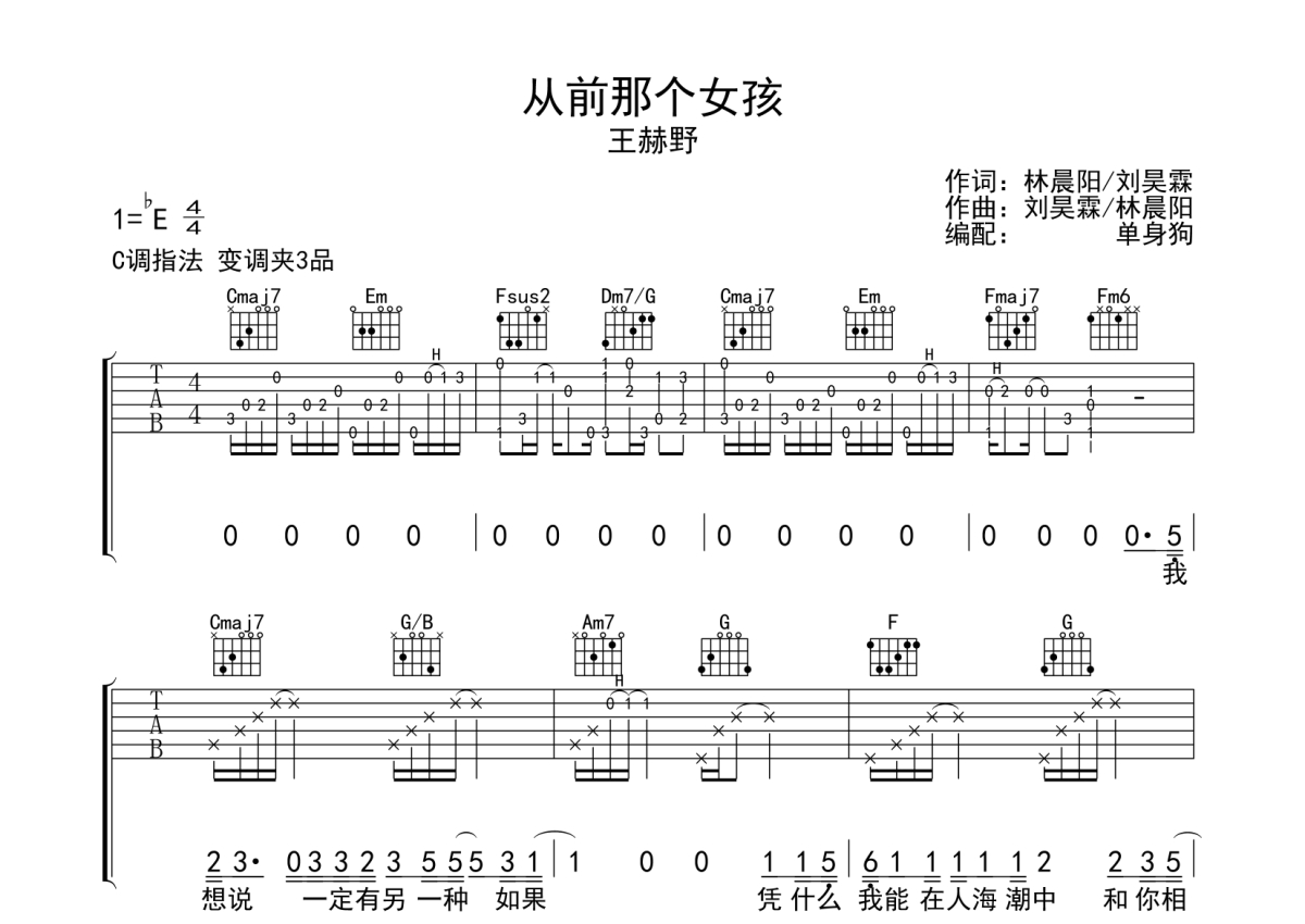 《从前那个女孩》是王赫野演唱的一首歌曲,拍号为4/4拍,歌曲原调为Eb调,但由于原调指法比较难,为了方便弹奏,本吉他谱采用的是C调指法编配,变调夹3品弹奏即为原调,当然也可以根据自己的音域改变变调夹位置,或者通过改变和弦调性,以方便自己弹奏,这份吉他谱共有三张高清图谱,图谱由 @单身狗 编配上传,图谱使用六线谱编配,包含吉他和弦指法、简谱以及歌词部分,使用这份从前那个女孩吉他谱,可以让你更加方便地掌握这首歌曲的弹唱技巧,快来尝试吧。
