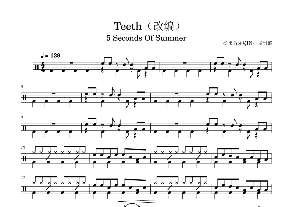 《Teeth(改编)》是5 Seconds Of Summer演唱的一首歌曲,拍号为4/4拍,这份架子鼓谱共有三张高清图谱,图谱由 @松果音乐QIN小强 编配上传,图谱使用五线谱编配,使用这份Teeth(改编)架子鼓谱,你将能够轻松地敲打出这首5 Seconds Of Summer的Teeth(改编),快来尝试吧。《Teeth》是由5 Seconds Of Summer演唱的一首歌曲,由Andrew Wotman、Ali Tamposi、Luke Hemmings、Ashton Irwin、Ryan Tedder、Louis Bell、Stephen Morris、Bernard Sumner、Peter Hook、Gillian Lesley Gilbert、Evan Rogers、Carl Sturken填词,Andrew Wotman、Ali Tamposi、Luke Hemmings、Ashton Irwi。