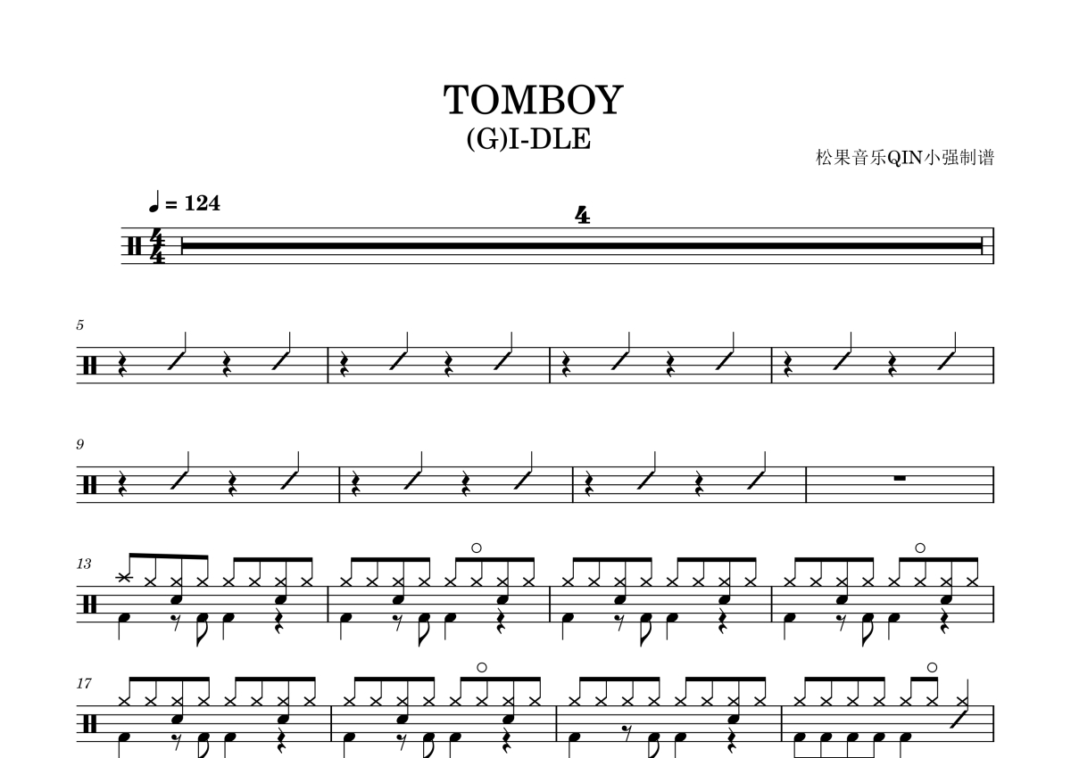 《TOMBOY》是(G)I-DLE演唱的一首歌曲,拍号为4/4拍,这份架子鼓谱共有三张高清图谱,图谱由 @松果音乐QIN小强 编配上传,图谱使用五线谱编配,使用这份TOMBOY架子鼓谱,你将能够轻松地敲打出这首(G)I-DLE的TOMBOY,快来尝试吧。《TOMBOY》是韩国女子组合(G)I-DLE演唱的歌曲,由田小娟作词,田小娟、Pop Time、JENCI作曲,收录在组合于2022年3月14日发行的首张正规专辑《I NEVER DIE》中。