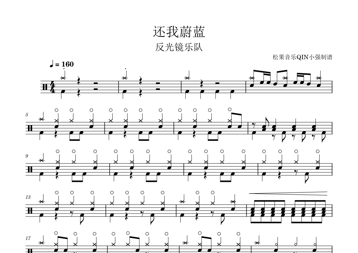 《还我蔚蓝》是反光镜乐队演唱的一首歌曲,拍号为4/4拍,这份架子鼓谱共有三张高清图谱,图谱由 @松果音乐QIN小强 编配上传,图谱使用五线谱编配,使用这份还我蔚蓝架子鼓谱,你将能够轻松地敲打出这首反光镜乐队的还我蔚蓝,快来尝试吧。《还我蔚蓝》是中国朋克乐队反光镜乐队的一首摇滚歌曲,由反光镜乐队创作并演唱,收录在2007年发行的专辑《成长瞬间》中。