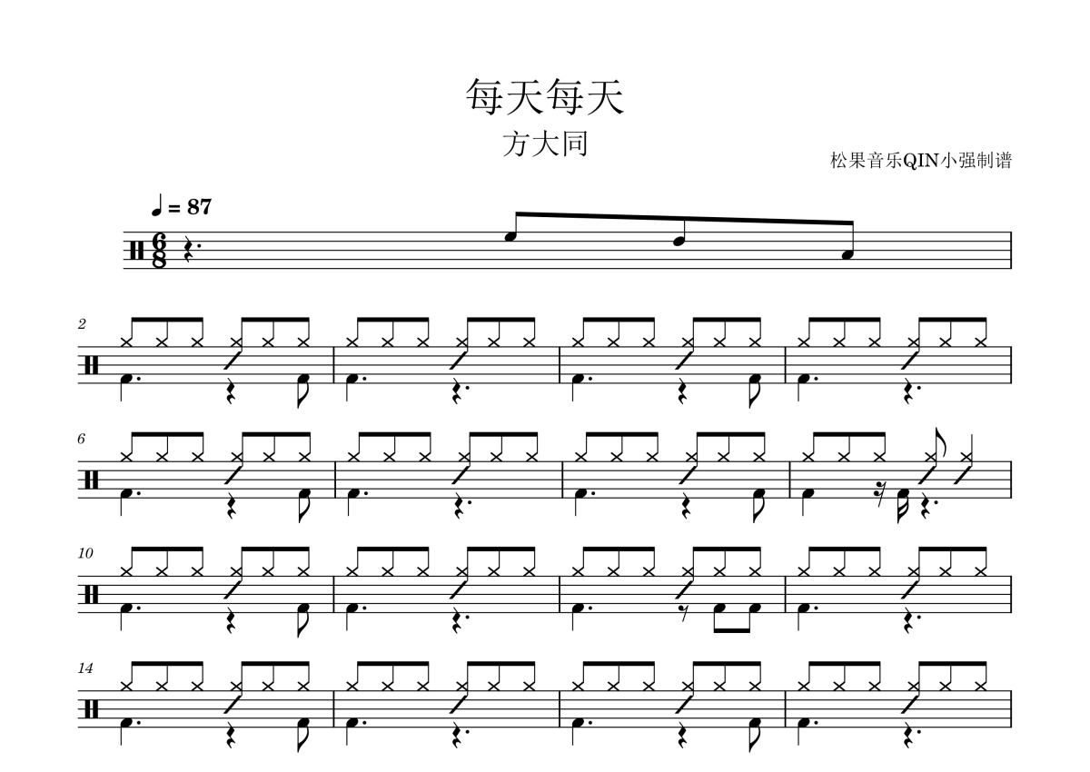 《每天每天》是方大同演唱的一首歌曲,拍号为6/8拍,这份架子鼓谱共有三张高清图谱,图谱由 @松果音乐QIN小强 编配上传,图谱使用五线谱编配,使用这份每天每天架子鼓谱,你将能够轻松地敲打出这首方大同的每天每天,快来尝试吧。《每天每天》是方大同演唱的一首歌曲,由娃娃填词,方大同谱曲,收录在专辑《Soulboy》中。
